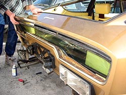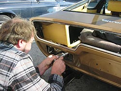 Step 6: Remove leatherette which hides frame under rear glass by pulling it off (it is glued on), unscrew frame brackets which hold the glass in place at each end on the inside of the trunk. Note that there is no need to remove the chrome trim, which holds the glass in place from the outside. Using plenty of WD40 gently tap the glass out of place towards the inside of the car, being careful not to damage the rubber gasket.