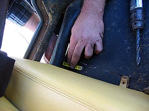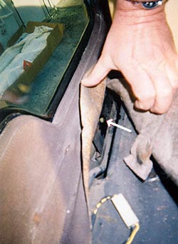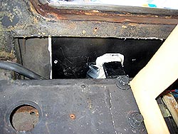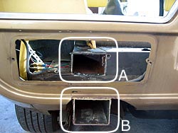 | Step 10: Peel the last layer of carpet padding up and away towards the front of the trunk, exposing the under floor of the trunk. Right in the center of the opening left by the removal of each rear light you will see the back end of a square section frame member (detail A). Cut out the rear “lid” that keeps it closed. Further inside there is another partial intrusion that needs to be cut off to allow for the rear bumper bracket to come in enough. Repeat on the other side. |