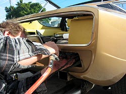 | Note that to do the right side you will have to disconnect the hose that goes from the fuel filler opening to the tank; seal tank opening and hose very tightly and carefully; exercise great caution due to the danger of fuel fumes (but without inflicting excessive torsion stress on what is likely old rubber) before continuing work. | ![]() |