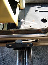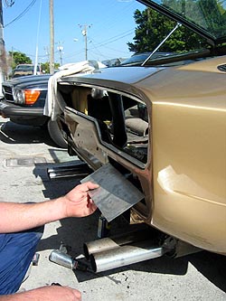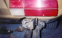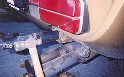 | Step 1: Remove the huge rear US bumper by unbolting it; there are two bolts underneath. Use caution, as it is ridiculously heavy. After removing the bolts pull the bumper towards you and off the car (suggest using it as diving platform for your pool, yacht or sending to Ralph Nader with a thank you NOT note!). | ![]() |