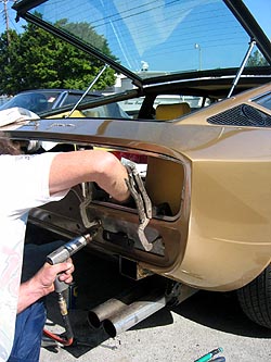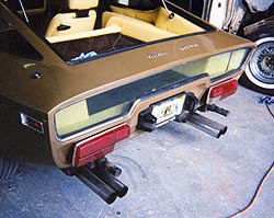 Using a plasma torch, a percussion tool or a small body shop saw (but not a torch unless fuel tank and all hoses have been removed), cut away these brackets. The whole purpose of this is to thereafter raise the exhaust mufflers and tips into the space you are clearing for them. Do not cut into chassis or body. The metal is quite thick, this is a gritty task, but soon enough will finish the task in a couple of hours and the heavy brackets will be history. The bracket on the right rear of the car has a hose which goes through it; this is part of the fuel tank; be careful around it. When you finish this, before going on to stage two of the exhaust muffler raising job, either re route this fuel line up and away from where the exhaust muffler will be or thoroughly wrap it in fire proof heat shielding material. Step 12: While the Euro rear bumper has seven bolts only the four (two at each end) that cater to the two brackets are relevant; you have a choice (the Khamsin is truly a car for independent thinkers!). The first solution is to cut off the three central ones flush with the surface of the bumper. They would simply attach to the body itself, not the frame and are therefore structurally useless in case of impact. The second solution is that, if you look carefully, the holes for these three bolts were in the body shell and plugged up for the US model; you can just tap these plugs out with a hammer and screwdriver. Just make sure that when fitting the bumper in place you use silicone, applied from the inside of the trunk, to prevent water and exhaust fume ingress. Which solution you choose is irrelevant, as long as you do it properly. Step 13: Attach the two brackets loosely to the rear bumper, with nuts or washers that prevent backing out. Now position the bumper and its brackets in place by inserting the brackets in the holes you cut out for them. Mark the spot where the bumper should be positioned (it should be close to the body but not touch it; 5 milimeters or 1/5 of and inch is about right). Make sure carefully that bumper position will be correct vertically, side to side and front to back; have a good photo of the back of a Euro car handy. |