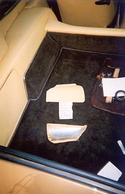 | Step 14: Once you are satisfied of the correct spots with the aid of a tape measure, mark them (there are two bolts per bracket detail A), procure the right bolts to thread into the brackets through the floor (make sure ahead of time that you have them handy). Drill the holes in the trunk floor, again be extremely careful as you are close to the fuel tank. Repeat on the other side. Note; these holes will be just under the lower end of the big box-like leather trim panel on each side of the trunk. As mentioned above you can either remove the trim panel completely or, unscrewing the screws that hold it onto the edge of the trunk floor, push it aside slightly while drilling, taking car not to damage the leather. Repeat procedure on other side. Set bumpers aside, position brackets in place loosely. Step 15: Now is the time to cut the hole in each sheet metal panels roughly in their center, for the bracket to pass. It is easiest to mark this spot and to cut an opening towards the bottom. Doing this will make it much simpler, allowing you to fit them from the inside of the car after you tighten the brackets to bumper nuts (which you will do once the brackets at their other end have been attached to the trunk floor). Set the plates aside for now. Step 16: Remove the brackets from the trunk, reattach the bumper loosely to them and mount the brackets and bumper in place. Tighten all bracket to bumper and bracket to trunk floor nuts gradually. Using shims of various thickness at the bumper end between the bumper and the nuts will allow you to achieve a consistent and adequate gap between the body and the bumper as you finalize its position, take your time doing this; it is important for an even fit but do not overtighten. Step 17: Now slide in the sheet metal panel. Rivet it in place along with the small extra piece that you cut to slide the panel in place around the bracket, closing off the hole as tightly as possible under the bracket. Repeat on other side. |